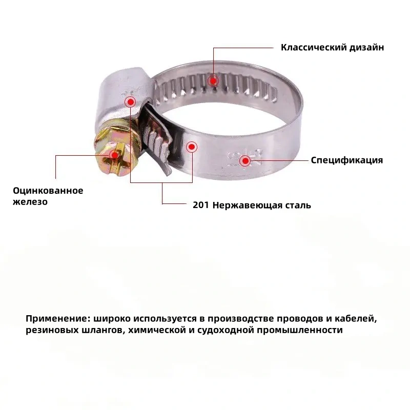 • Сборка: Лента, корпус и винт собираются вместе, образуя готовый хомут. При сборке важно обеспечить точное соединение деталей и прочность соединения.